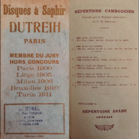 Musique particulière de Sa Majesté Sisowath ស៊ីសុវត្ថិ , le roi du Cambodge en visite à Paris en 1906, enregistré par le label Dutreilh sous la direction du musicologue, écrivain et sinologue Louis Laloy.