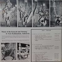 Contents: SIDE I - Kenyah. A - Music for entertainment, feasts, celebrations ; B - Lute and mouth organ ; C - Songs and other musical instruments. SIDE II - Modang. A - Ritual song, gongs and drums ; B - Other instruments : ring flute, jew's harp, bamboo percussion ; C - Songs ; D - Cure of the sick.